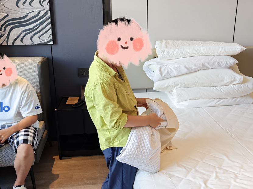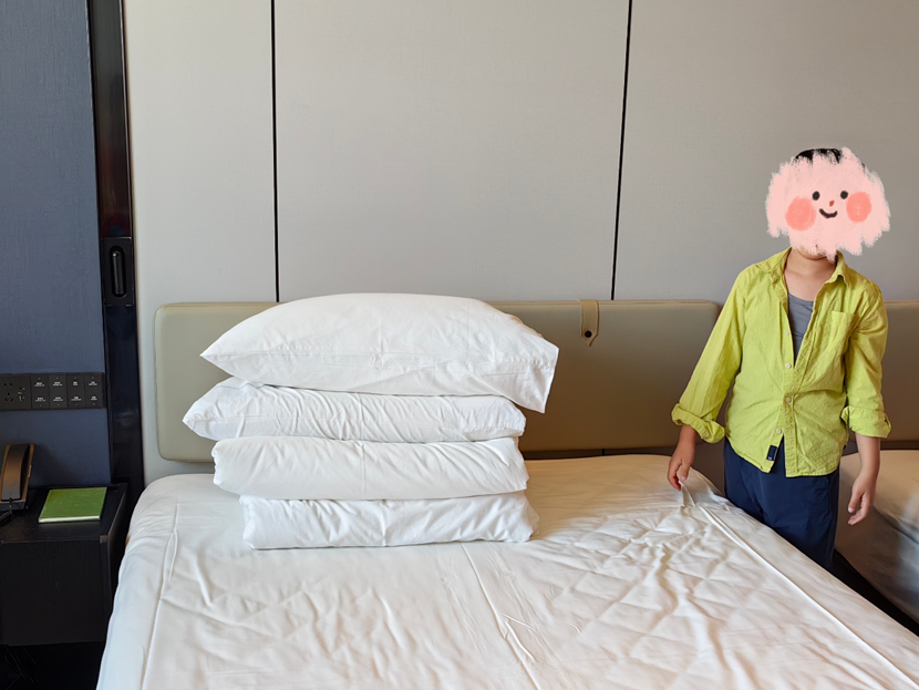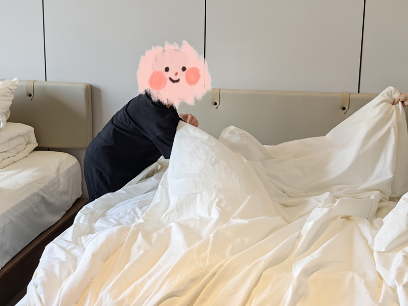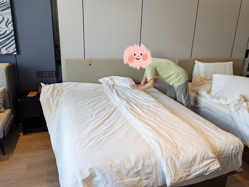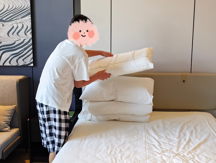 孩子们首先挑战的是客房整理,他们要自己完成套枕套、铺床单、叠被子和物品归位。不少孩子已经能在老师的分步指导下顺利做完,有几个能力好一些的,可以全程独立完成。有一个男孩套枕套特别拿手,最快一次只用了15秒,动作又快又稳。