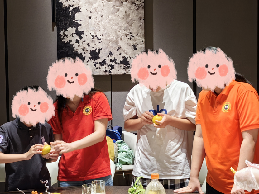 接下来是学剥水果,厨房老师带着大家依次处理橘子、芒果和柚子。橘子比较容易,从顶上开个口,再往下剥就行;芒果比较费劲,因为皮紧贴果肉,孩子们得花更多力气;柚子则要更细心,得注意不能把果肉剥断,否则就散了。孩子们一边看示范,一边慢慢动手学,虽然动作不那么熟练,但都努力跟着做完了。