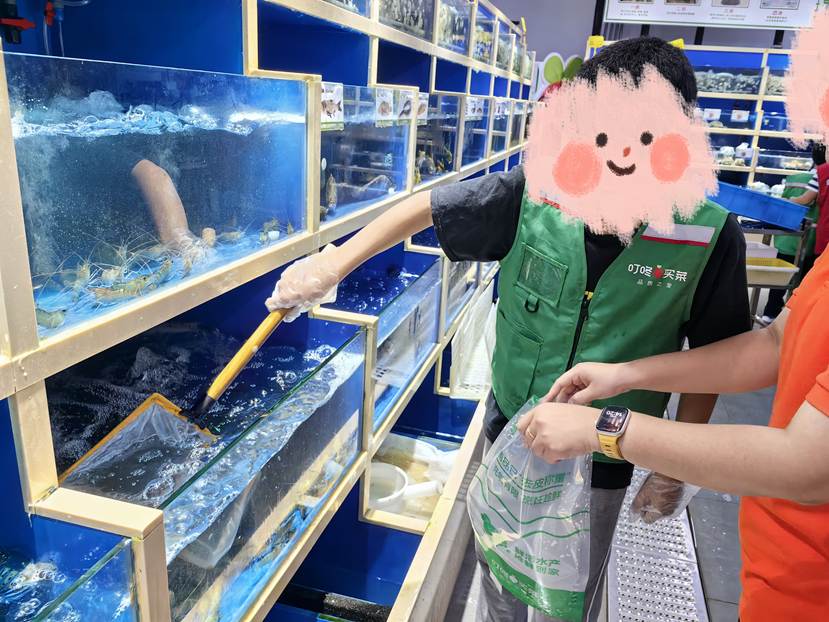 随后的实践环节中,孩子们分组轮岗,投入理货、捕捞与打包的实践环节。他们仔细比对商品日期,将更新鲜的牛奶、水果向货架内摆放,将过期商品单独处理;学习用网兜捞起活蹦乱跳的虾,同时分拣出已经不能售卖的“尸体”;还按照订单要求,在相似水果中准确挑出指定克数的柚子。这些看似简单却至关重要的流程,让孩子们真切体会到“精准”与“责任”在生鲜配送中的意义。