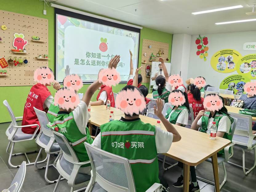 “有没有人帮家里买过菜?在哪买的?”叮咚老师从孩子们一进入前置仓就开始提问。许多孩子踊跃举手,有的说和妈妈去过菜场,有的表示是通过手机线上下单。紧接着,叮咚老师通过一段视频,直观讲解了前置仓的整体运作情况。