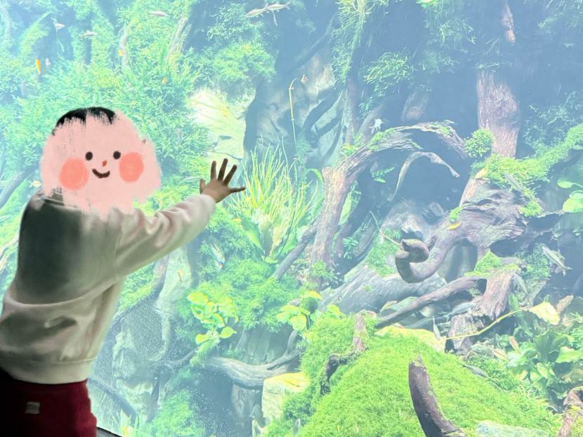 沿着小径向前,便进入了二号馆的“云上森林”。这里完全是另一番天地:板根大树稳稳扎根,水上森林的树木将枝干伸进清澈的水里。孩子们趴在玻璃墙上细看鱼儿在水里游来游去,脸上满是好奇。