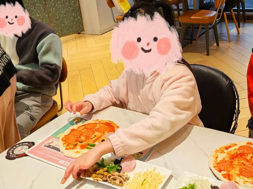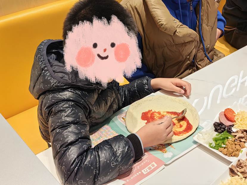 制作过程里,成长的惊喜无处不在:曾把酱料涂得满盘都是的彩彩,如今握着勺子缓缓转动披萨盘,不仅铺得均匀,还会主动补上不足的地方。小易则严格遵循 “先蔬菜后芝士” 的顺序,将食材摆放得错落有致。