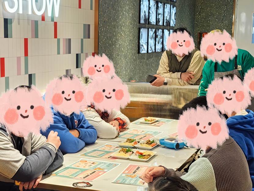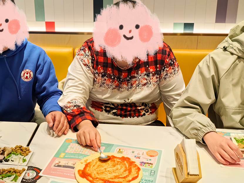 从走进店门那刻起,不少孩子们就展现出了“小主人”般的从容。找座位、洗手的准备步骤井然有序。孩子们围坐在桌前,仔细观摩披萨师傅的示范。随后,大家开始认真地用勺子抹匀番茄酱。