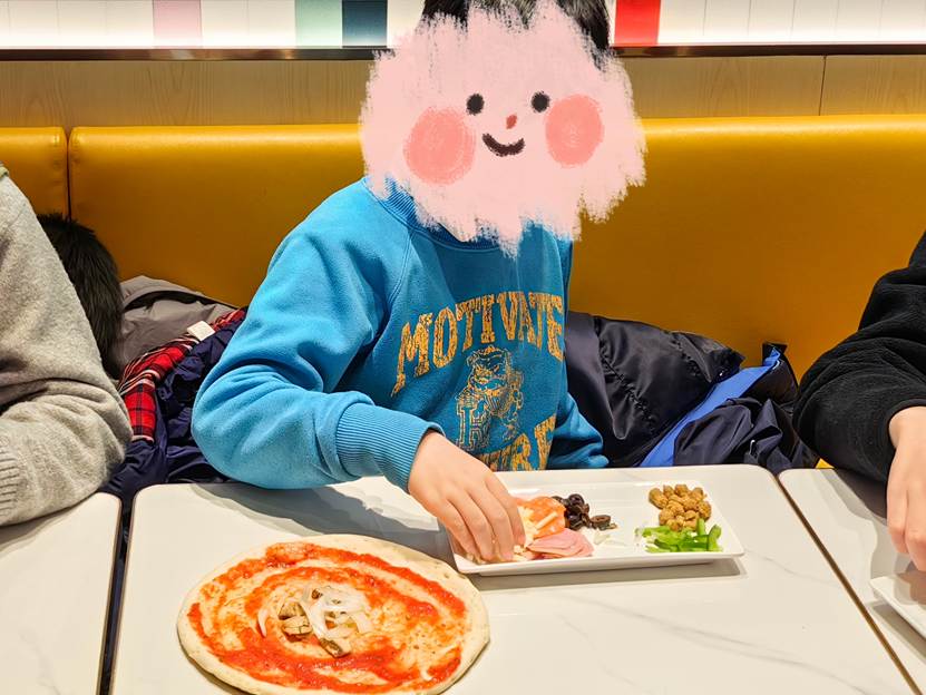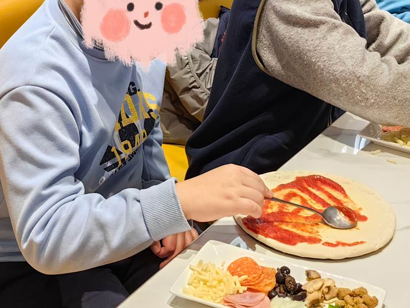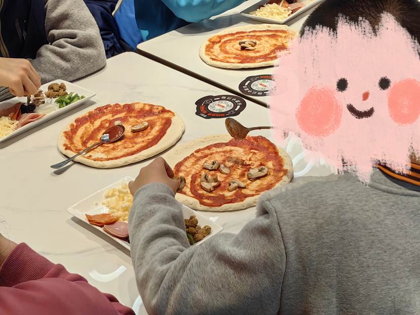 孩子们轻车熟路地完成各项准备工作,从洗手到排排坐,每个步骤都显得格外熟练。当面团与配料分发到手,每个人都沉浸在自己的创作节奏中:小心翼翼地抹匀酱料,认真思索着食材的摆放。