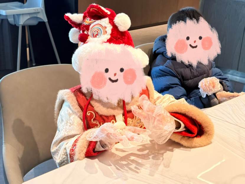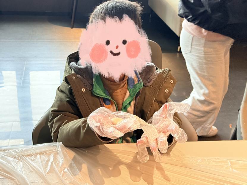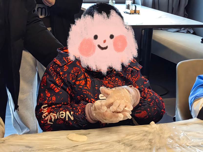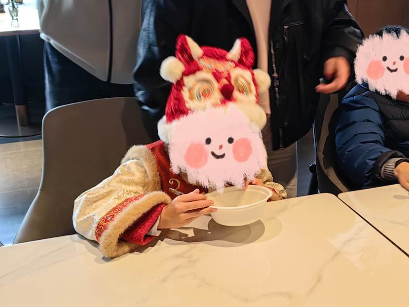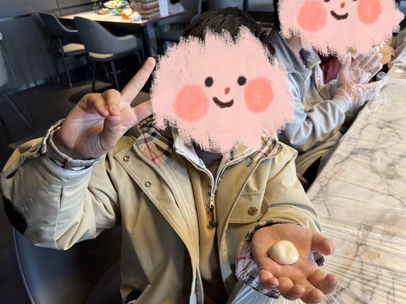 紧接着是充满节日氛围的汤圆制作。工作人员端出提前揉好的糯米团和黑芝麻馅,分到每个人面前,再告诉大家元宵节的意义。孩子们学着把糯米团压扁,包入馅料,再放在手心里来回搓。最终的成品形态各异,有的圆润饱满,有的稍显扁圆,也有的变成了 “黑皮” 汤圆,每一颗都是孩子们独一无二的创作。