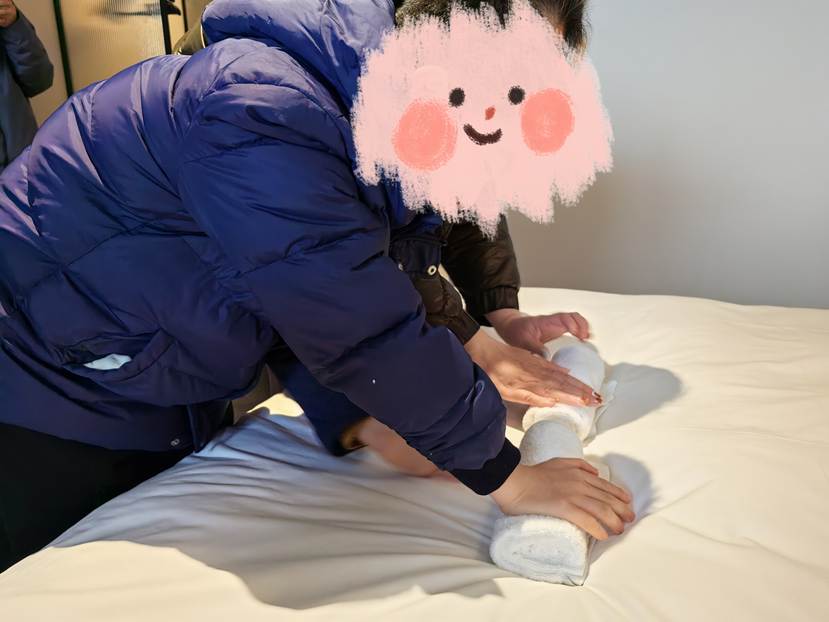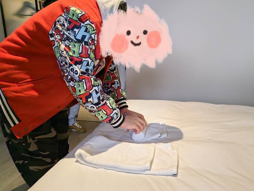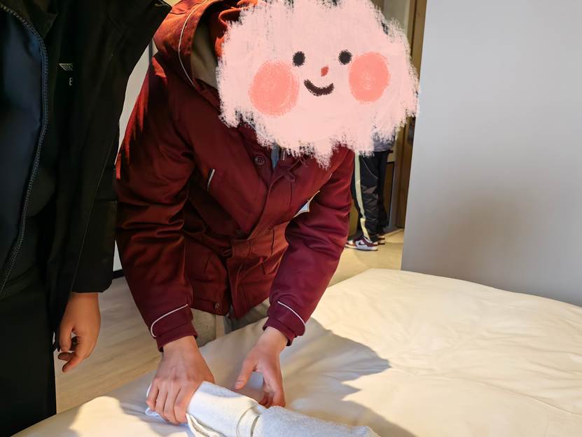 活动先从整理客房毛巾开始。孩子们要把平铺的毛巾卷成紧实的毛巾卷,再整齐摆放在架子上。客房老师先做示范,把毛巾对折、卷起,最后一圈刚好压住边角,一个立得住的毛巾卷就完成了。轮到孩子们动手时,有的孩子手劲用得好,三两下就卷得又紧又稳;有的卷着卷着毛巾就散开了,也不急,拿起来重新尝试。老师在旁边看着,时不时帮一把,或者提醒哪一步没对齐。慢慢地,大家手里的毛巾卷都有模有样了,一个个立在架子上,整整齐齐。
